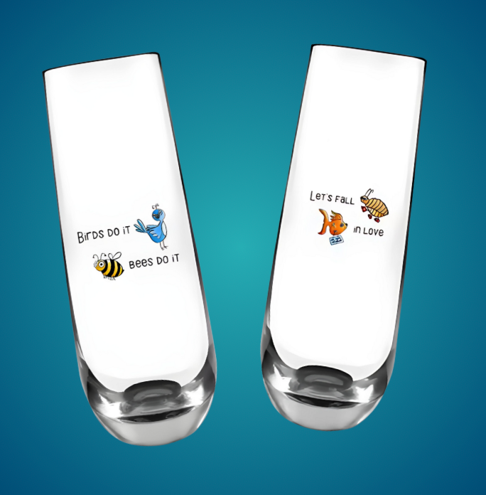 These glasses feature whimsical artwork inspired by the classic tune "Let's Do It" and are the perfect gift for music and romance enthusiasts.